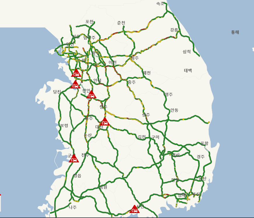 - 경부고속도로: 부산 방향으로 반포∼서초 2㎞, 죽전 부근∼수원 6㎞, 천안∼천안분기점 6㎞, 천안휴게소∼청주분기점 25㎞ 구간에서 정체가 발생했습니다. 천지일보