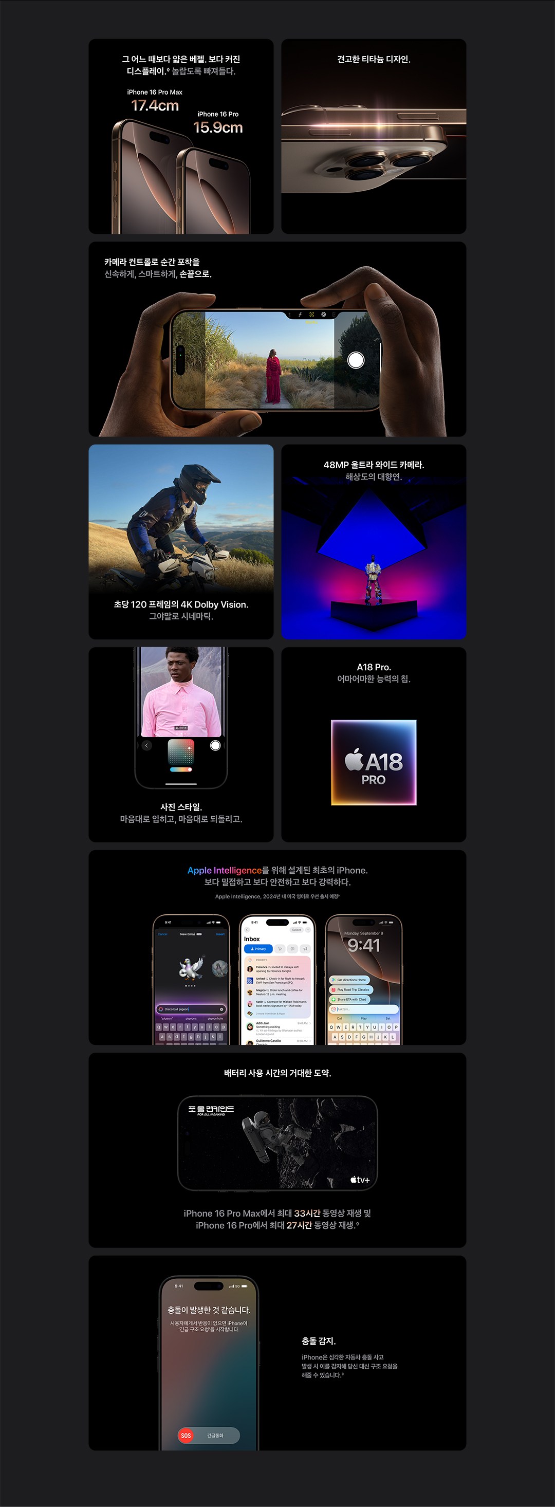 - Apple Intelligence: 개인화된 AI 기능이 추가되어, 통화 녹음, 이메일 요약, 사진 라이브러리 정렬 등 다양한 기능을 지원합니다. 이 기능들은 사용자의 일상생활을 보다 스마트하고 편리하게 만들어줍니다.