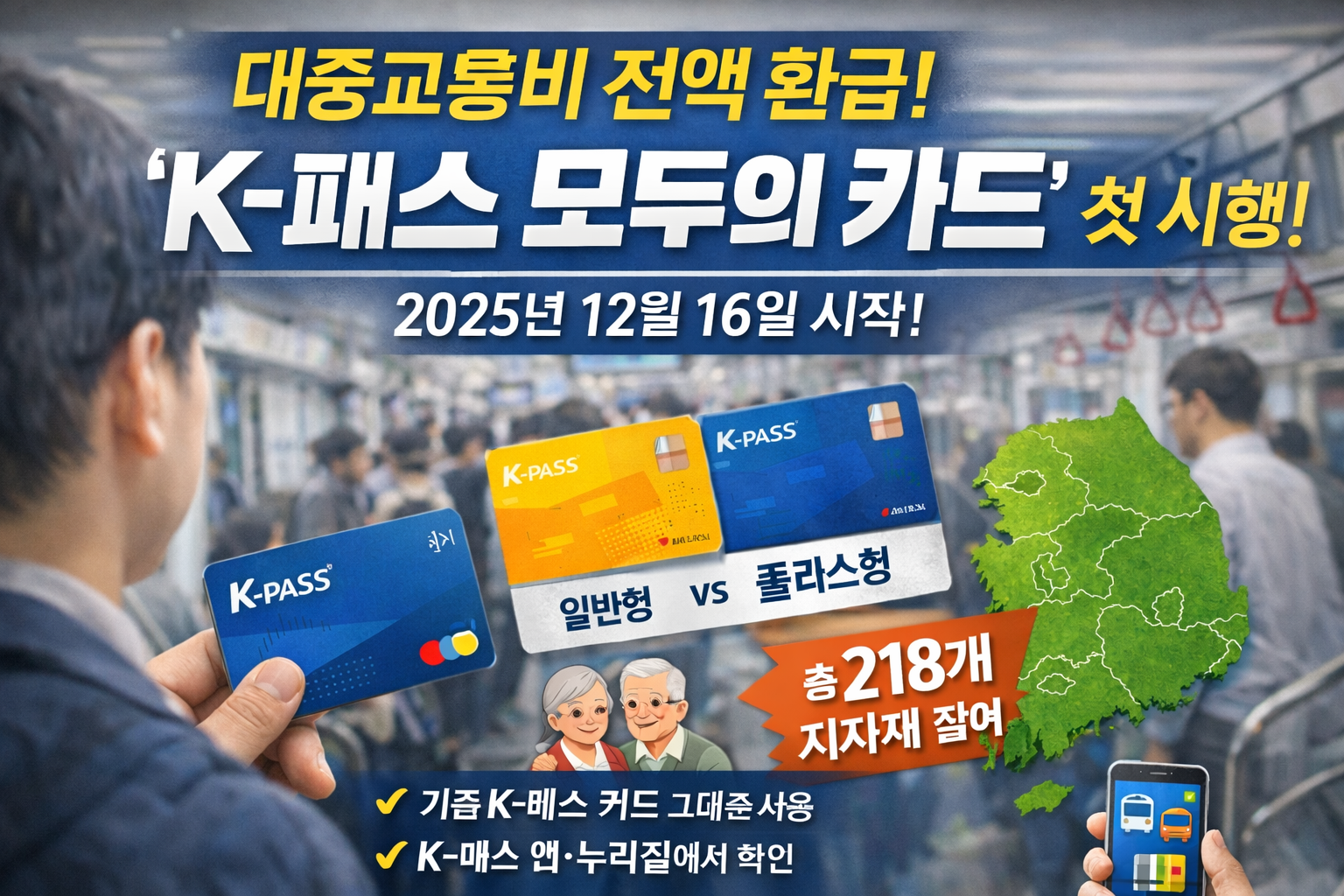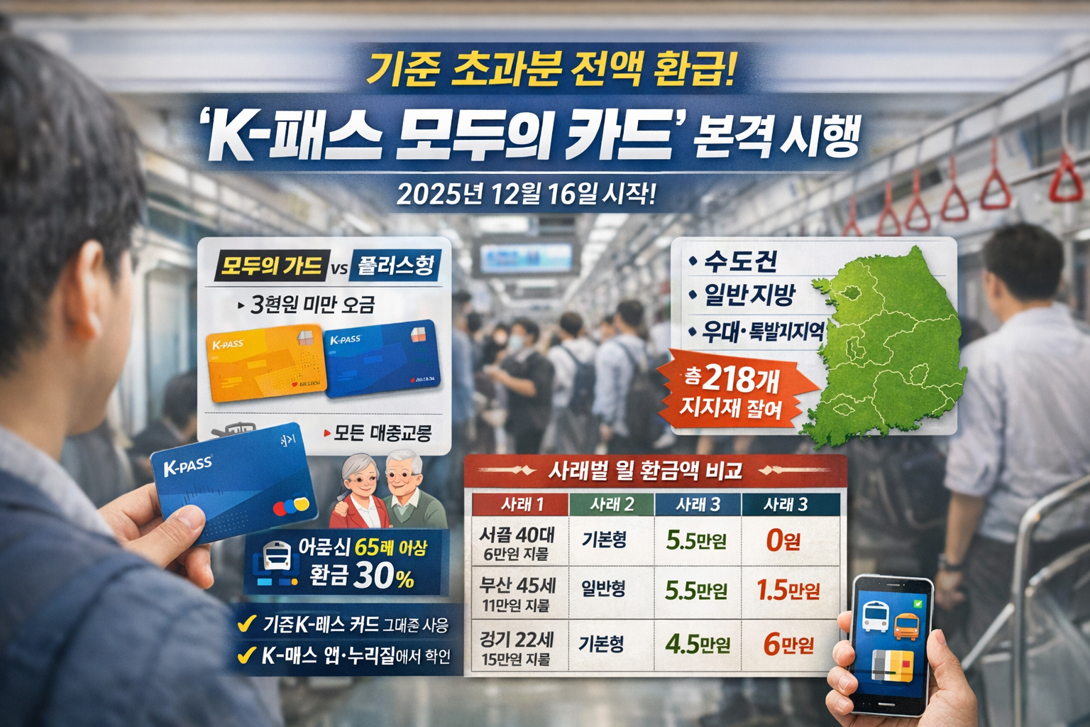 대중교통을 자주 이용하는 국민의 교통비 부담을 획기적으로 줄이기 위해 K-패스 환급 제도가 대폭 확대된다. 국토교통부 대도시권광역교통위원회는 2025년부터 기존 K-패스에 더해 **월 환급 기준금액을 초과한 교통비를 전액 돌려주는 ‘모두의 카드’**를 새롭게 도입한다고 밝혔다. 이번 개편의 핵심은 이용자가 별도 선택을 하지 않아도, 월별 이용 내역을 기준으로 가장 유리한 환급 방식이 자동 적용된다는 점이다.