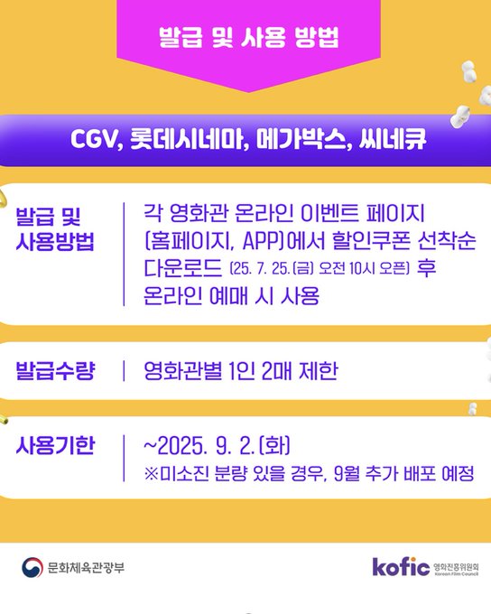 소형 영화관도 쿠폰을 받을 수 있나요? 네, 현장에서 선착순으로 수령할 수 있습니다.