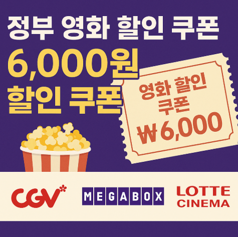 2025년 하반기 정부 영화 할인 쿠폰이 6,000원 할인권으로 다시 찾아왔습니다. 7월 25일 금요일 오전 10시부터 450만 장이 선착순으로 배포되며, CGV·롯데시네마·메가박스·씨네큐 등 주요 멀티플렉스와 전국 소형·독립영화관에서도 사용할 수 있습니다. 발급일로부터 9월 2일까지 이용 가능하고, 문화가 있는 날·조조·청소년·장애인 할인과 중복 적용되어 단돈 1,000원에 영화를 관람할 수 있는 기회가 열립니다.