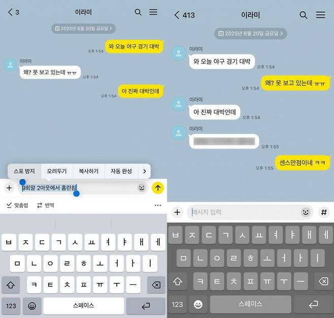 메시지 입력창에 작성 숨기고 싶은 텍스트 부분 길게 터치 팝업 메뉴에서 ‘스포 방지’ 선택