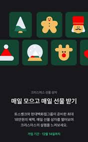 토스 크리스마스 이벤트는 매일 새로운 선물과 활동으로 연말의 즐거움을 배가시키는 특별한 기회를 제공합니다. 어드벤트 캘린더부터 나눔을 실천할 수 있는 눈사람 만들기, 그리고 산타 선발대회까지 다채로운 이벤트를 통해 사용자들이 따뜻한 크리스마스를 보낼 수 있도록 기획되었습니다.