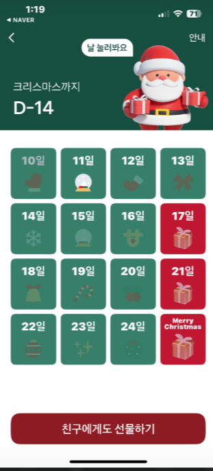 - 이벤트 개요: 매일 새로운 선물과 혜택이 공개되는 캘린더 형식의 이벤트입니다.
