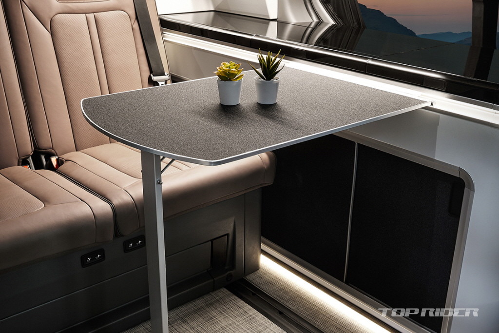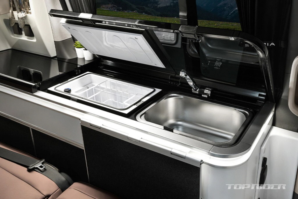 캠퍼 모델은 경쟁차 대비 낮은 전고(2,095mm)로 대다수의 지하주차장을 이용할 수 있는 장점을 갖추고 있습니다. 4인승 모델에는 12.1인치 접이식 통합 컨트롤러와 모니터, 3열 리클라이닝 밴치, 청수통 70ℓ 및 오수통 40ℓ, 싱크대, 냉장고 등 캠핑에 필수적인 장비들이 모두 탑재되어 있습니다.