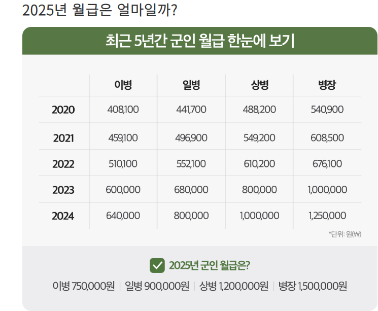 2025년부터 군인의 급여와 복지가 전반적으로 향상됩니다. 병장은 월급 150만 원에 '내일준비적금' 지원금까지 더해 205만 원을 받으며, 부사관 및 간부 급여도 대폭 인상될 예정입니다. 주거, 의료, 교육 등 복지 혜택까지 강화되어 군 복무 환경이 개선됩니다.