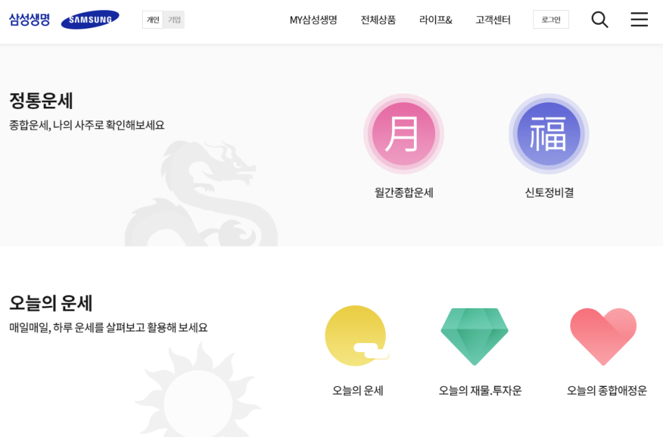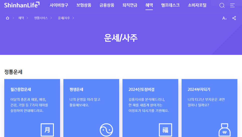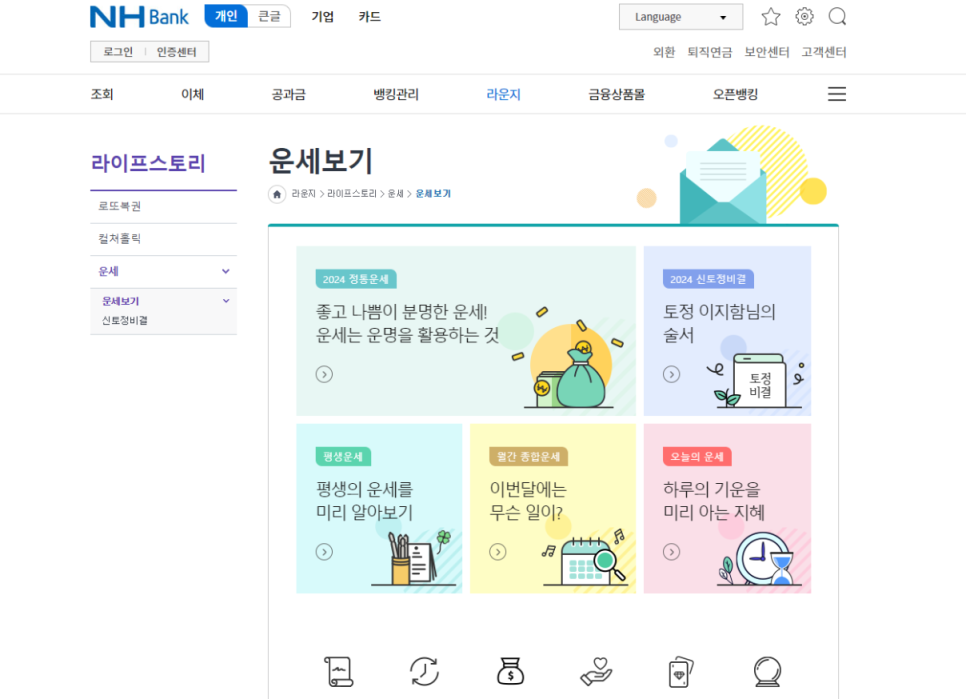 신한은행은 신한라이프 SOL 앱을 통해 매년 무료 토정비결 서비스를 제공합니다. 이곳에서는 운세뿐만 아니라 재정 계획에 유용한 조언도 함께 얻을 수 있어 금전운까지 한 번에 확인할 수 있습니다. 생년월일과 성별만 입력하면 당해의 운세가 바로 나오기 때문에 쉽고 간편하게 사용할 수 있으며, 신한은행 계좌가 없어도 누구나 이용할 수 있다는 점이 큰 장점입니다.
