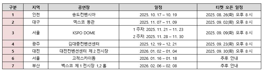 - 부산 벡스코 (제1전시장 1·2홀): 2026년 2월 6일 ~ 2월 8일 (예매 일정 추후 공지)