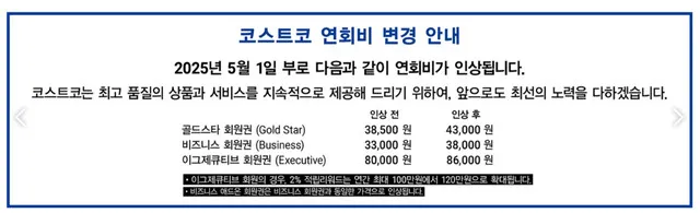 코스트코 코리아는 2025년 5월 1일부터 연회비를 다음과 같이 인상합니다: