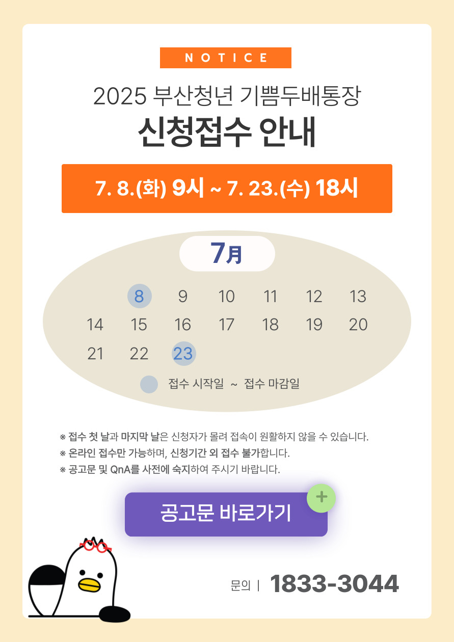 - 신청기간: 2025년 7월 8일(화) 09:00 ~ 7월 23일(수) 18:00 모집인원: 총 6,000명, 추첨 방식 부산광역시