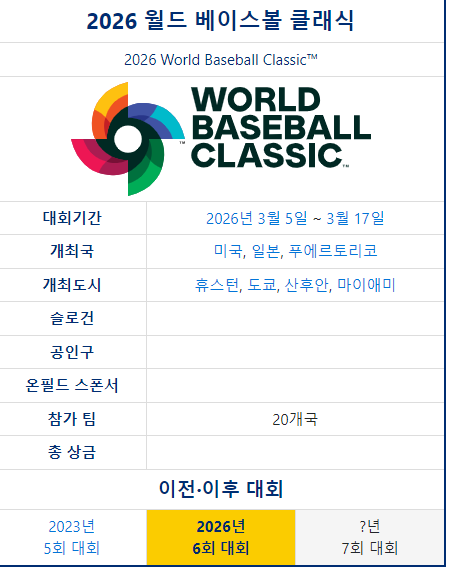 2026년 WBC는 3월 5일부터 17일까지 개최되며, 총 20개국이 참가합니다. 한국이 속한 C조의 경기는 일본 도쿄돔에서 3월 5일부터 10일까지 진행됩니다. 조별리그를 통과한 팀들은 미국 휴스턴과 마이애미에서 8강전과 준결승전을 치르며, 결승전은 마이애미에서 개최됩니다. 한국의 첫 경기는 3월 5일 체코와의 경기로 시작되며, 3월 7일에는 일본과, 3월 9일에는 호주와 맞붙게 됩니다. 이번 대회에서는 각 조의 상위 두 팀이 8강에 진출하게 되며, 한국은 반드시 일본과 호주를 이겨야 8강에 진출할 가능성이 높습니다.